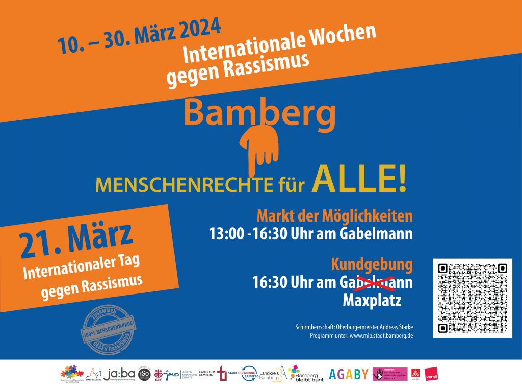 am 21. März 2024 laden der Migrantinnen- und Migrantenbeirat der Stadt Bamberg und seine Kooperationspartnerinnen und -partner dazu ein, gemeinsam auf dem Maxplatz in Bamberg ein klangvolles und unüberhörbares Zeichen zu setzen. Unter dem Motto „Menschenrechte für ALLE“ wollen wir zusammen gegen Rassismus und Diskriminierung aufstehen und für die Anerkennung gleicher Rechte aller Menschen unabhängig von Herkunft, Religion, Hautfarbe, Geschlecht und Sprache eintreten.