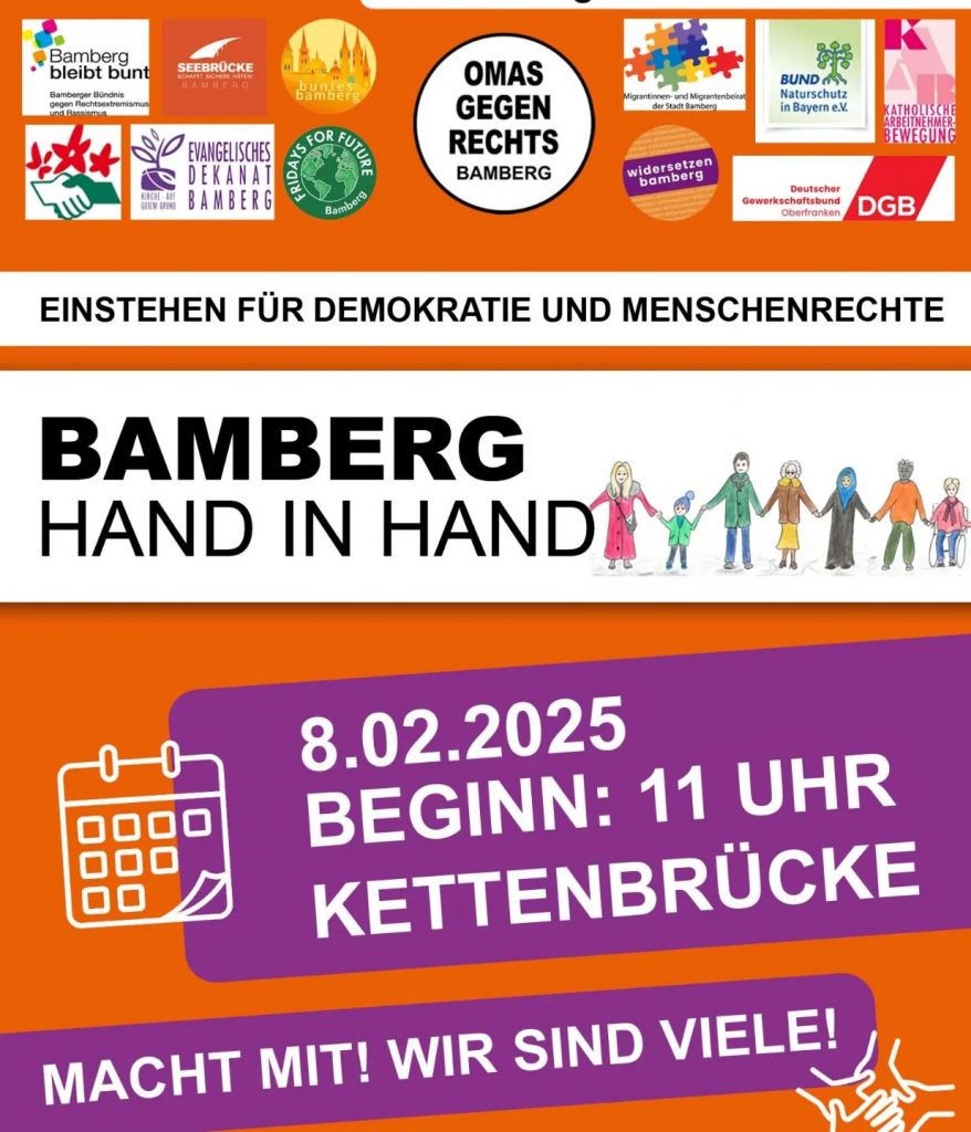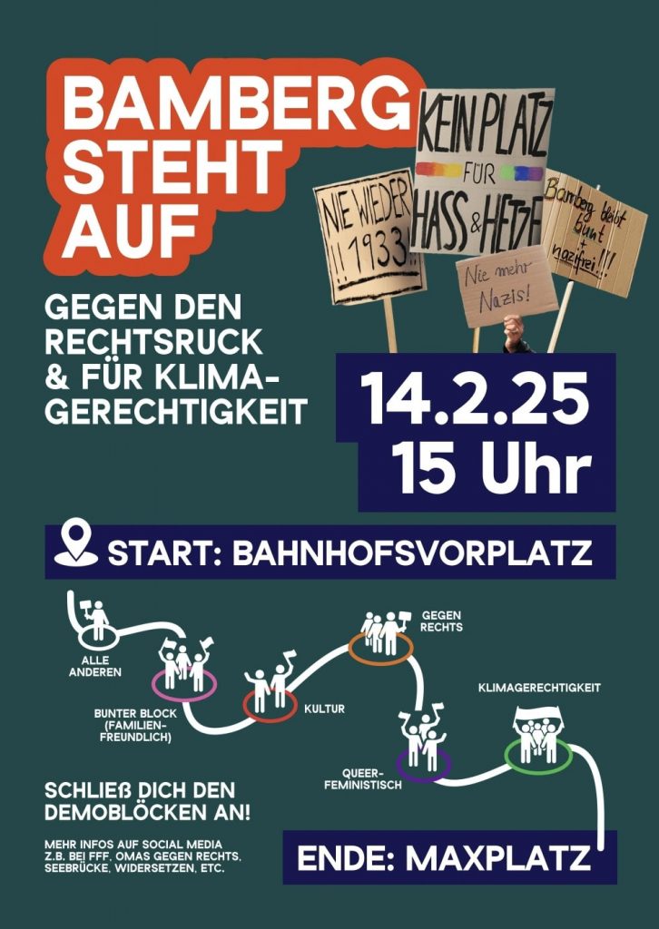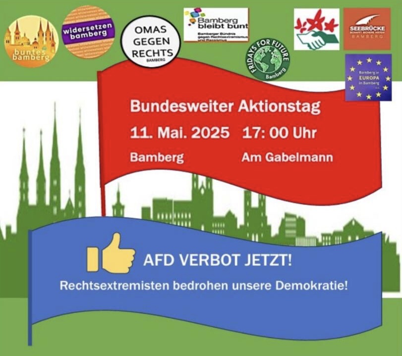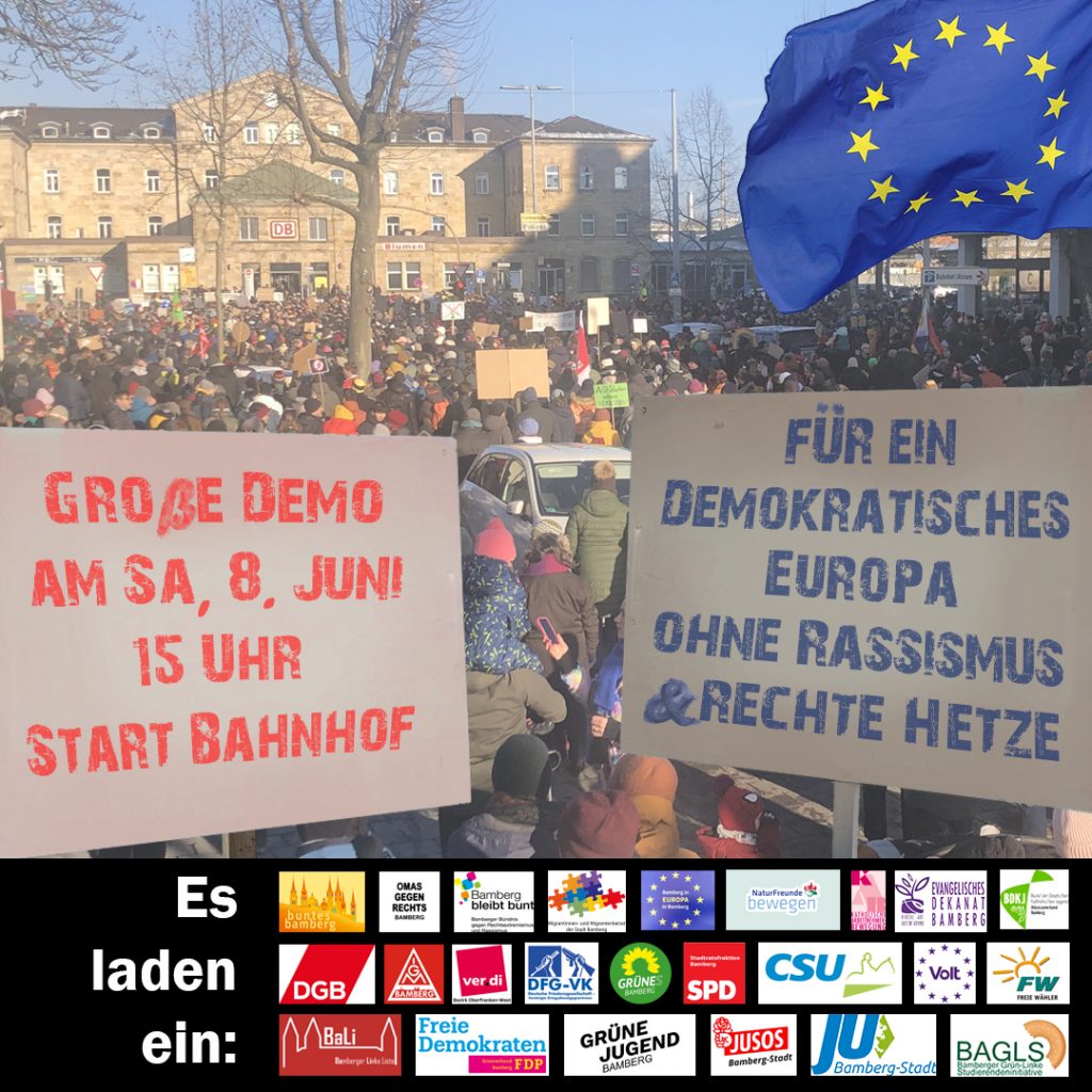 Mit der nahenden Europawahl werden im ganzen Land wieder tausende Menschen auf die Straße gehen und unsere Demokratie sowie die mit ihr verbundenen Grundrechte für alle Menschen verteidigen. Auch Bamberg wird wieder dabei sein, mit einer großen Demo am Tag vor der Europawahl.
