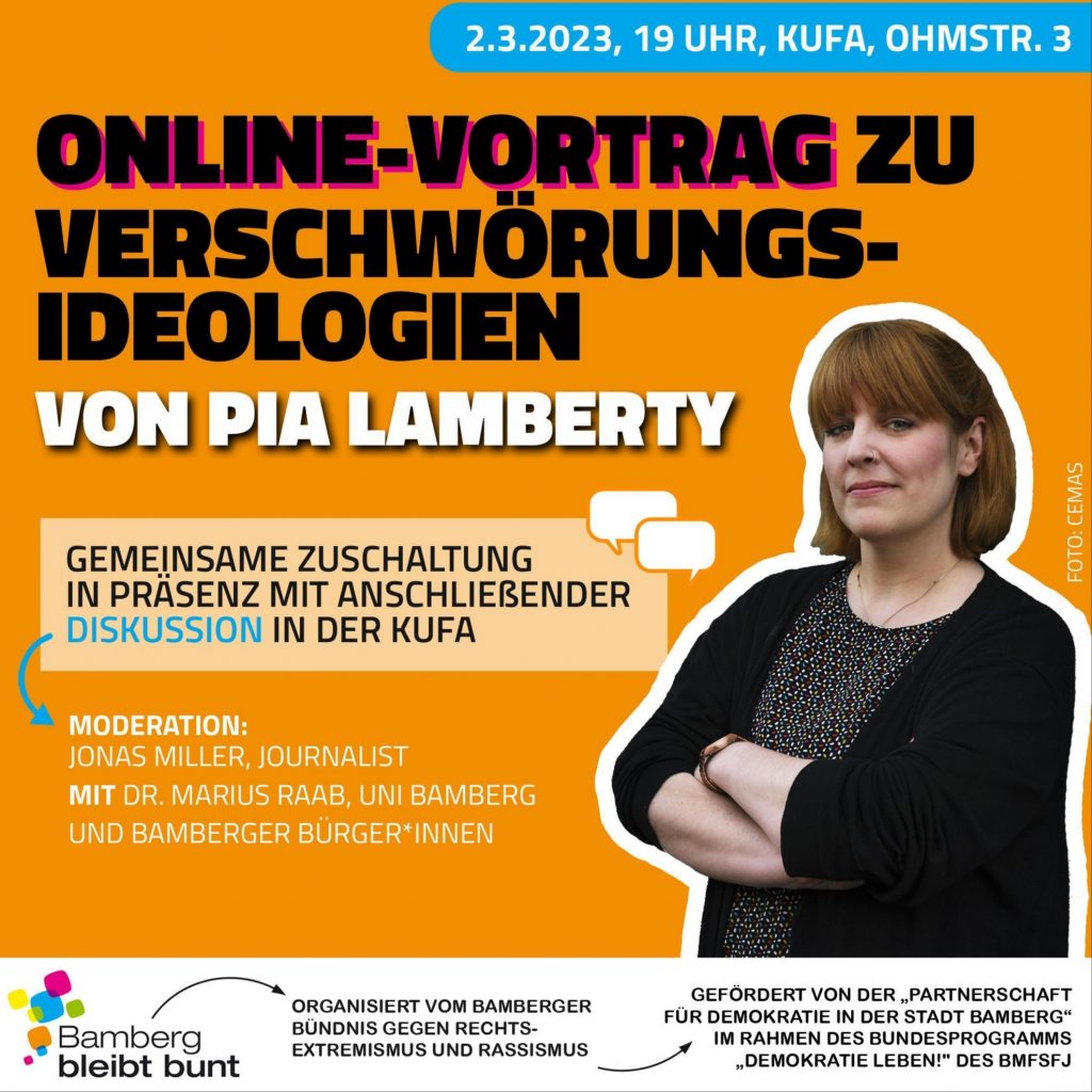 Auch Bamberg verfügt über eine regelmäßig im öffentlichen Raum auftretende Gruppierung, die sich zu Corona-Zeiten gebildet hat, und die bei Kundgebungen sowie auf Social-Media Verschwörungstheorien verbreitet. Über 100 Teilnehmer*innen waren der Einladung in die Kufa gefolgt, bei der Pia Lamberty, Sozialpsychologin und Geschäftsführerin beim Center für Monitoring, Analyse und Strategie (CEMAS) online hinzugeschaltet über Verschwörungsideologien sprach. Im Anschluss gab es eine moderierte Podiumsdiskussion mit Dr. Marius Müller, Uni Bamberg, Leonie Ackermann, Aktivistin in der Stadt Bamberg und einer Vertreterin der OMAS GEGEN RECHTS BAMBERG. Die Moderation führte Jonas Miller, Journalist.