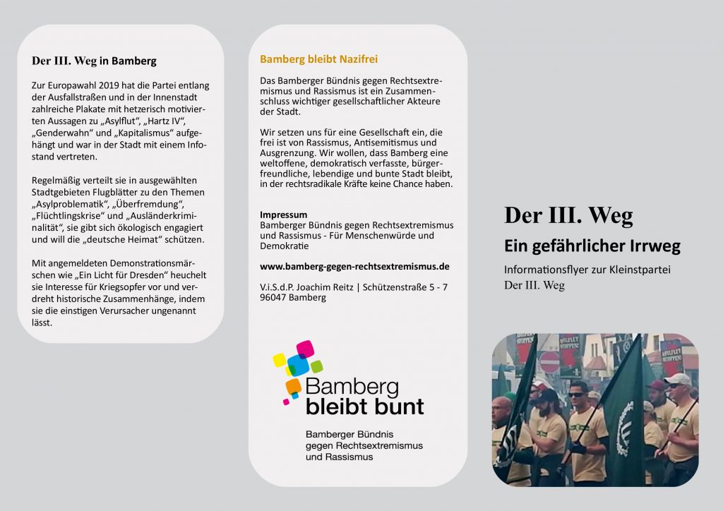 Anlässlich eines Demonstrationszug der Kleinstpartei „Der III. Weg“, informierte das Bündnis gegen Rechtsextremismus und Rassismus auf dem parallel stattfindenden „Fest der Demokratie“ über die rechtsextremistische Partei (vgl. Flyer).