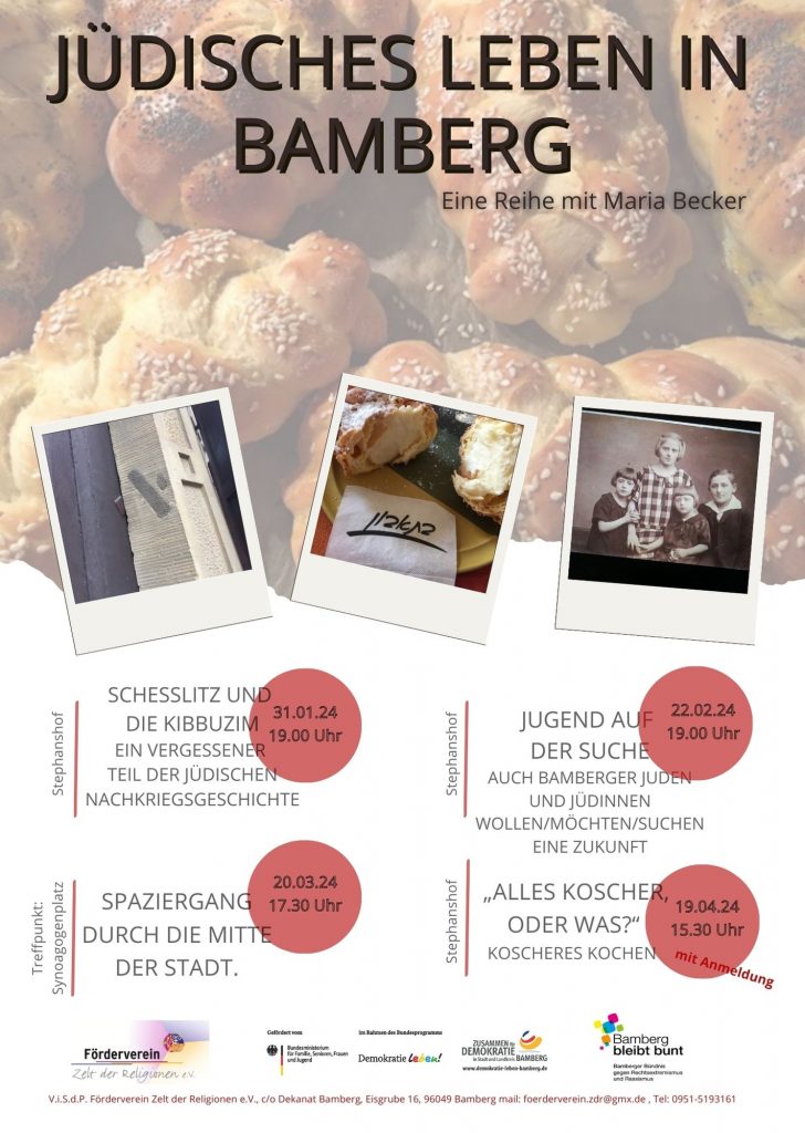 Beginnend mit zwei Vorträge zum Thema „Kibbuzim und jüdisches kollektives Leben“ und „Antisemitismus in Geschichte und Gegenwart“ folgte am dritten Abend ein „Stadtrundgang: Jüdisches Leben in Bamberg“, um die Orte der einst großen jüdischen Gemeinschaft in unserer Stadt wahrzunehmen. Den Abschluss bildet ein „Koscher Kochkurs“, bei dem es um Kultursensibilität untereinander im gemeinsamen Kochen und Essen geht. Als Referentin konnten wir Maria Becker gewinnen.