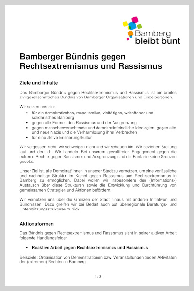 Wir setzen uns ein für eine Gesellschaft, die frei ist von Rassismus, Antisemitismus und Ausgrenzung. Wir wollen, dass Bamberg weiterhin eine weltoffene, demokratisch verfasste, bürgerfreundliche, lebendige und bunte Stadt bleibt, in der rechtsradikale Kräfte keine Chance haben.